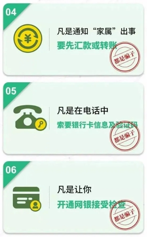(3)凡是自稱公檢法機關(guān)或醫(yī)保局等部門,以涉嫌嚴重違法犯罪并需要保密等為由,索要銀行卡信息及密碼、驗證碼進行“資金清算”或者讓你直接把錢打到所謂的“安全賬戶”的。